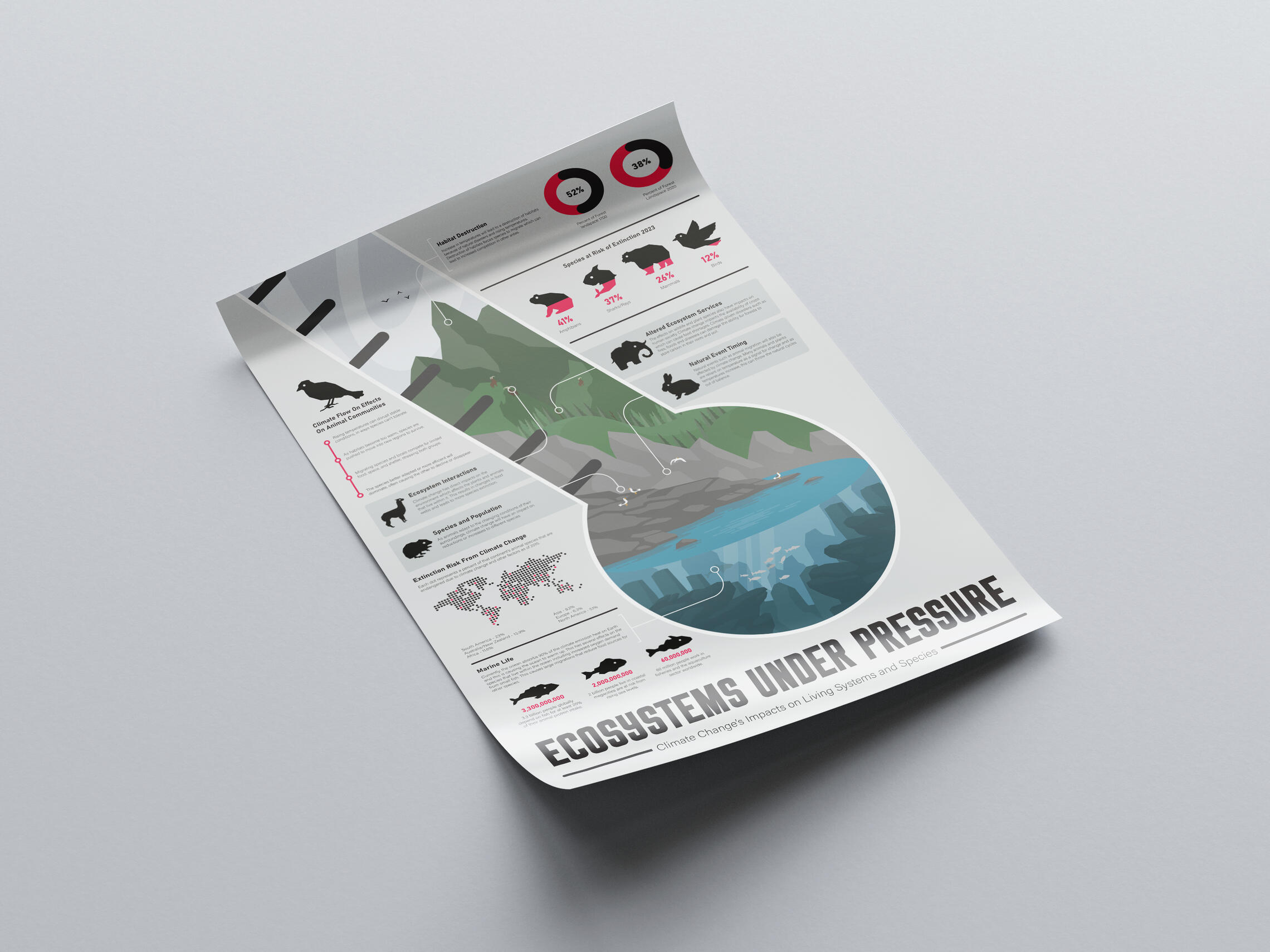 The task for this project was to create an infographic on one aspect of climate change. This infographic was to be designed in A2 size to be printed out as a poster for the university. The infographic should clearly translate complex information into an accessible visual narrative, helping viewers quickly understand issues, causes and impacts of the chosen topic. I chose to create my infographic on the impact climate change has on ecosystems and wildlife.