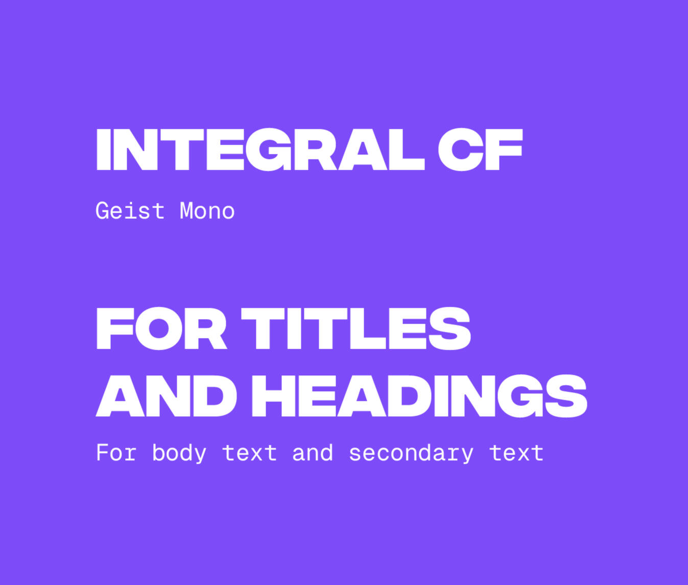 Integral CF is used for the primary font because it is bold and similar in style and energy to the logo. Geist Mono is a light slab serif font that contrasts from the primary font creating a clear and readable hierarchy.
