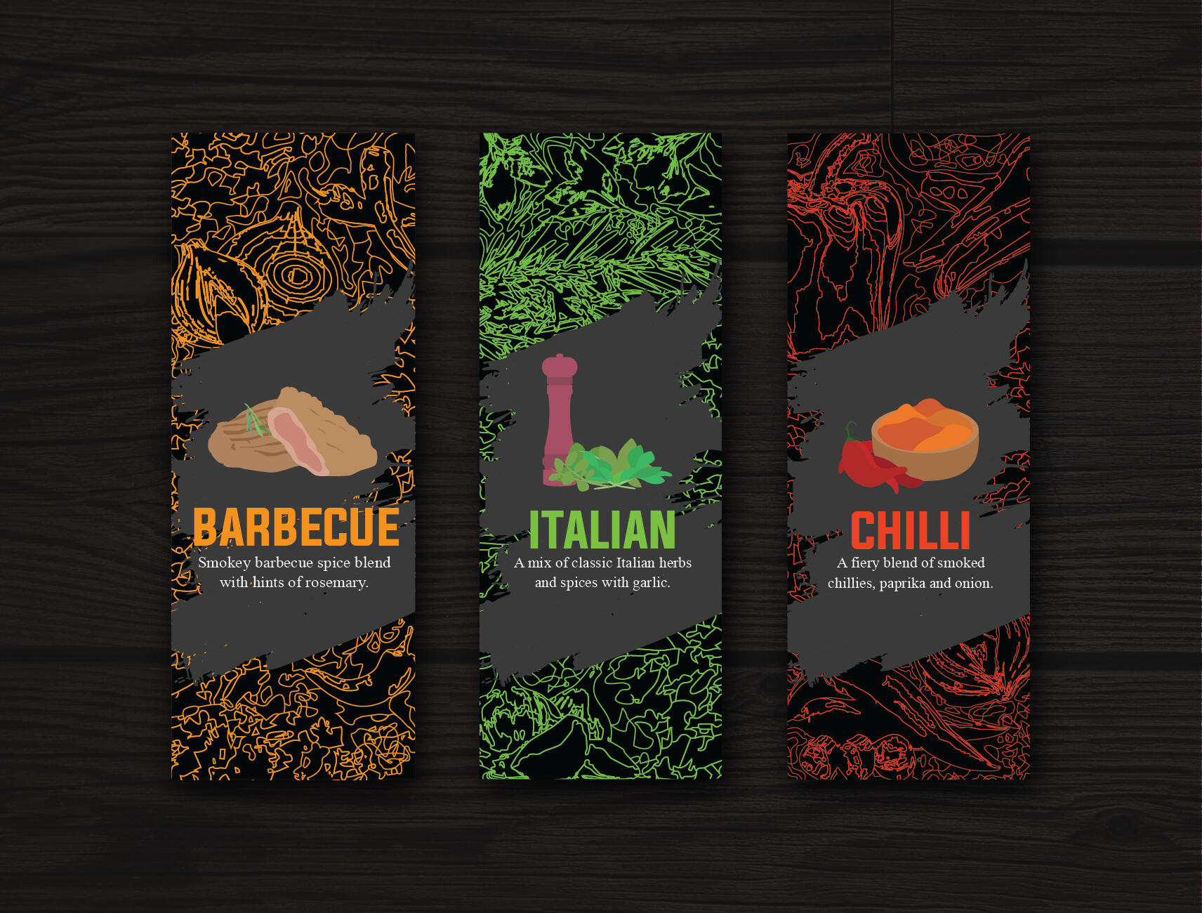 The spice bottle labels were designed using a dark colour scheme to convey sophistication and exclusivity. The background uses a stylised effect inspired by the pattern of contour lines.The background uses a brush stroke style pattern to communicate the artesian and handcrafted quality of the product. These design choices help position the brand toward a high end market.