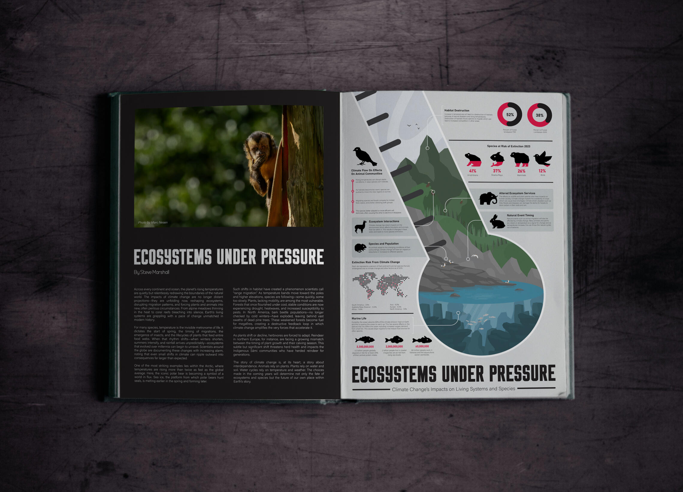 The task for this project was to create an infographic on one aspect of climate change. This infographic was to be designed in A2 size to be printed out as a poster for the university. The infographic should clearly translate complex information into an accessible visual narrative, helping viewers quickly understand issues, causes and impacts of the chosen topic. I chose to create my infographic on the impact climate change has on ecosystems and wildlife.
